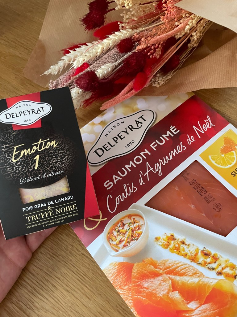Comme chaque fin d’année Delpeyrat nous régale pour les fêtes avec une nouvelle spécialité de foie gras, une recette à la truffe noire. Un foie gras au goût très raffiné avec un coté boisé et des notes de noisettes et de champignons. Le foie gras de canard à la truffe noire Émotion 1 au prix de 23,95€ les 190grs. Pour son saumon fumé Delpeyrat a voulu apporter un peu d’originalité en l’accompagnant de coulis de différentes saveurs, agrumes, épices et crème de truffe. Je me suis décidé pour le saumon fumé au coulis d’agrumes de Noël et j’en ai été ravie ! (8,45€ les 120grs +40grs de coulis).