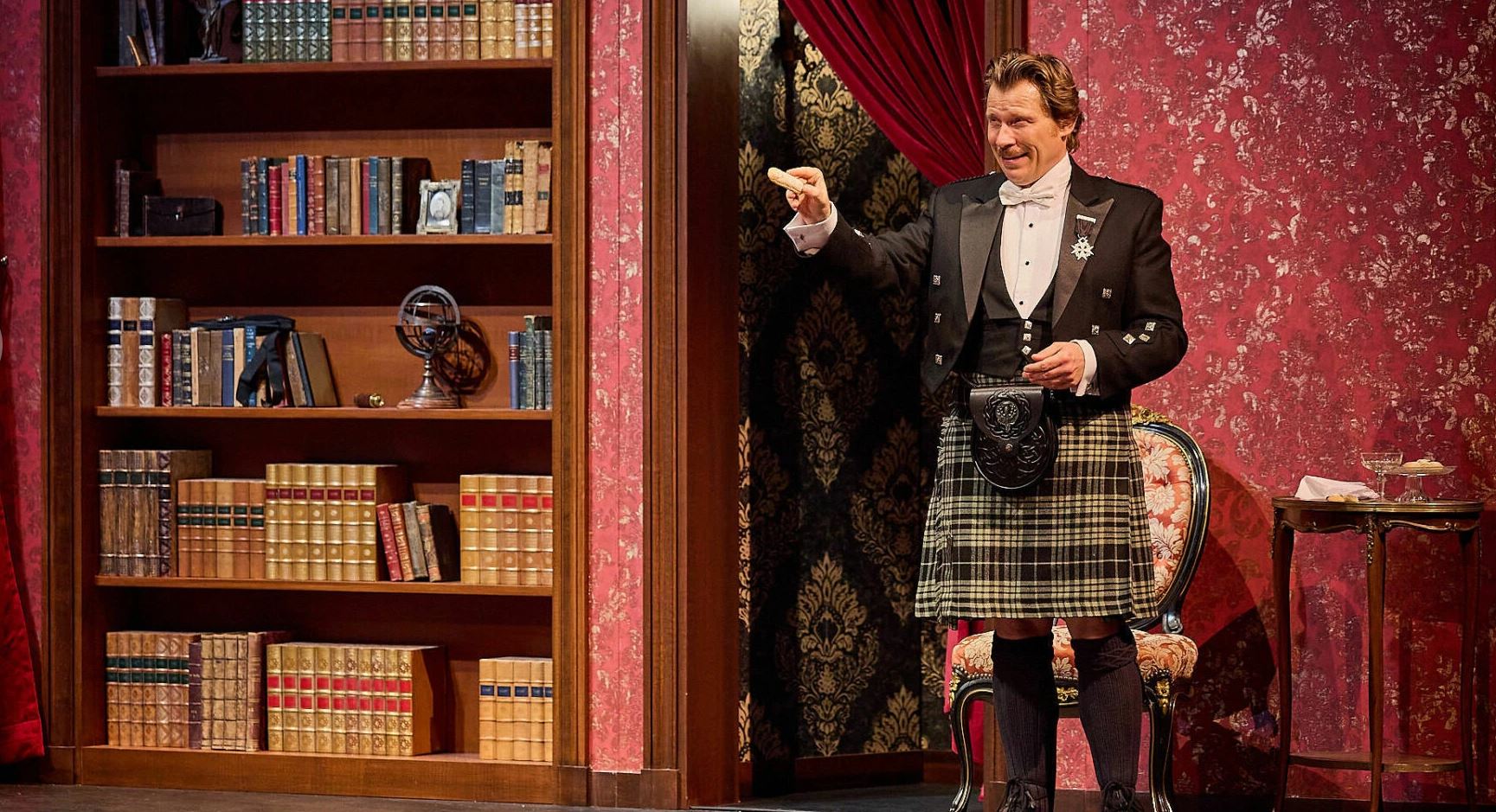 Elie Rapp et Ludovic Laroche ont conjugué leurs talents dans une mise en scène qui occupe judicieusement la scène. Le salon chaleureux, aux tapisseries rouges et mobilier brun possède une vue mythique. Avec Big Ben en ligne de mire, la vidéo permet de faire varier le ciel et le temps, en même temps que les lumières extérieures.