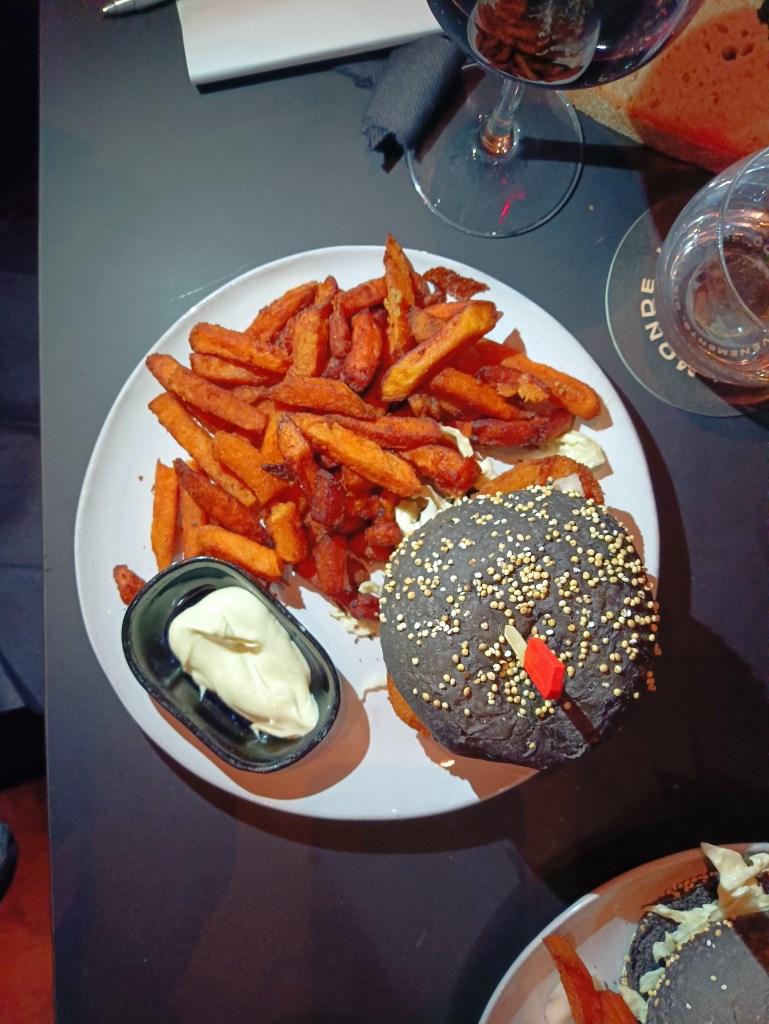 Nous prenons toutes deux en plat le Katsu Burger accompagné de ses frites de patate douce. Vous pensiez savoir tous des burgers ? Celui-là est encore plus original, avec un poulet pané aux cornflakes, sa mayonnaise au wasabi frites et le croquant du pakchoï. Il ne pouvait pas être autrement accompagné que par des frites de patate douce.