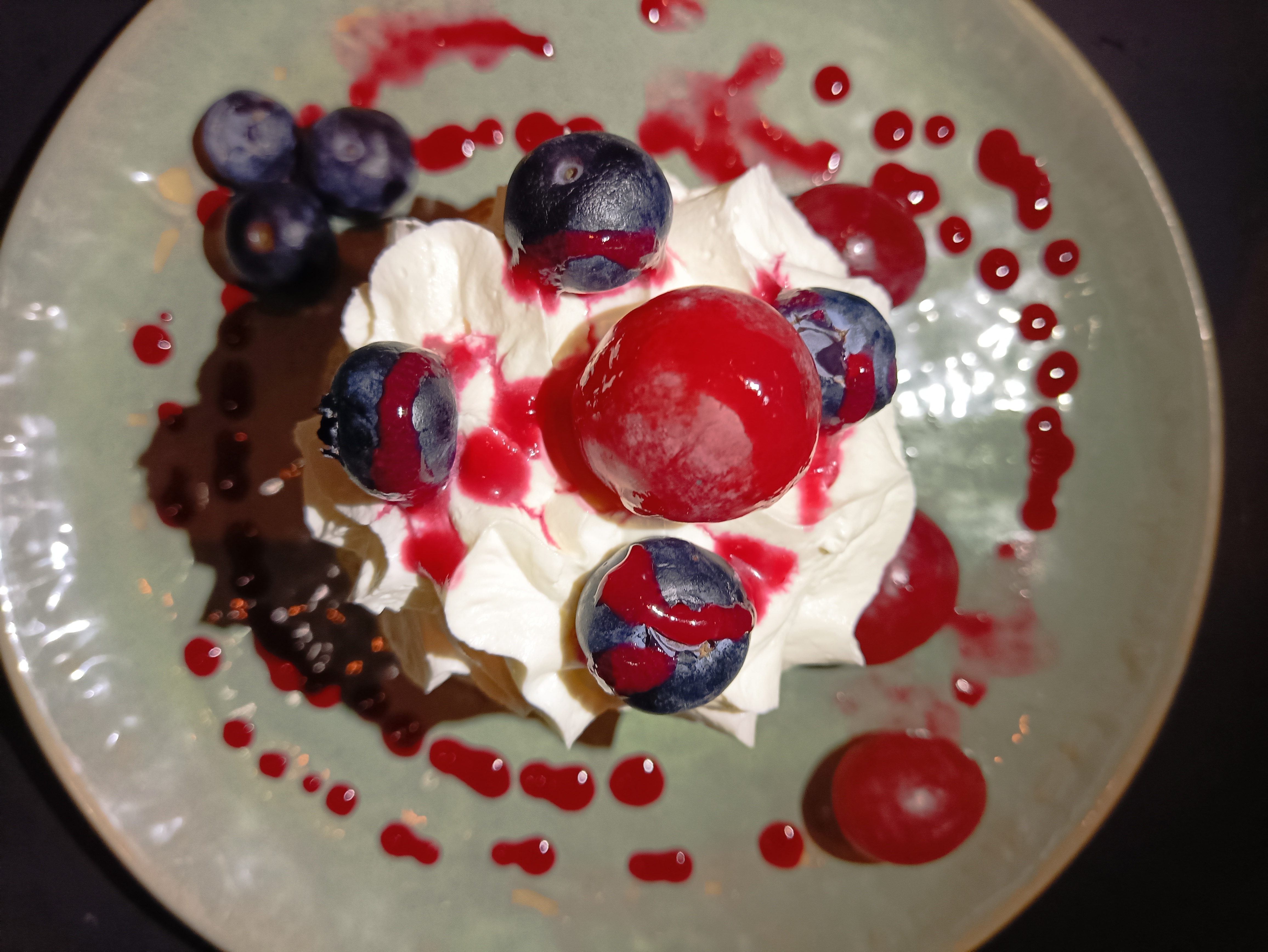 Falco choisit un café gourmand mêlant mini Baba, salade de fruits et mousse au chocolat aux zestes d’agrumes. La mousse au chocolat aux notes d’agrumes et de grenade est originale et fleurie d’une pensée.