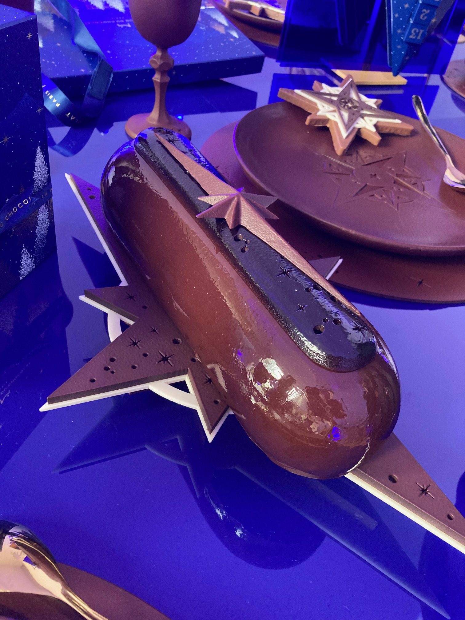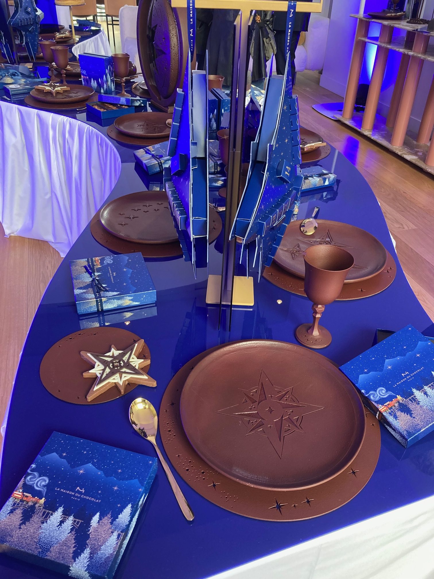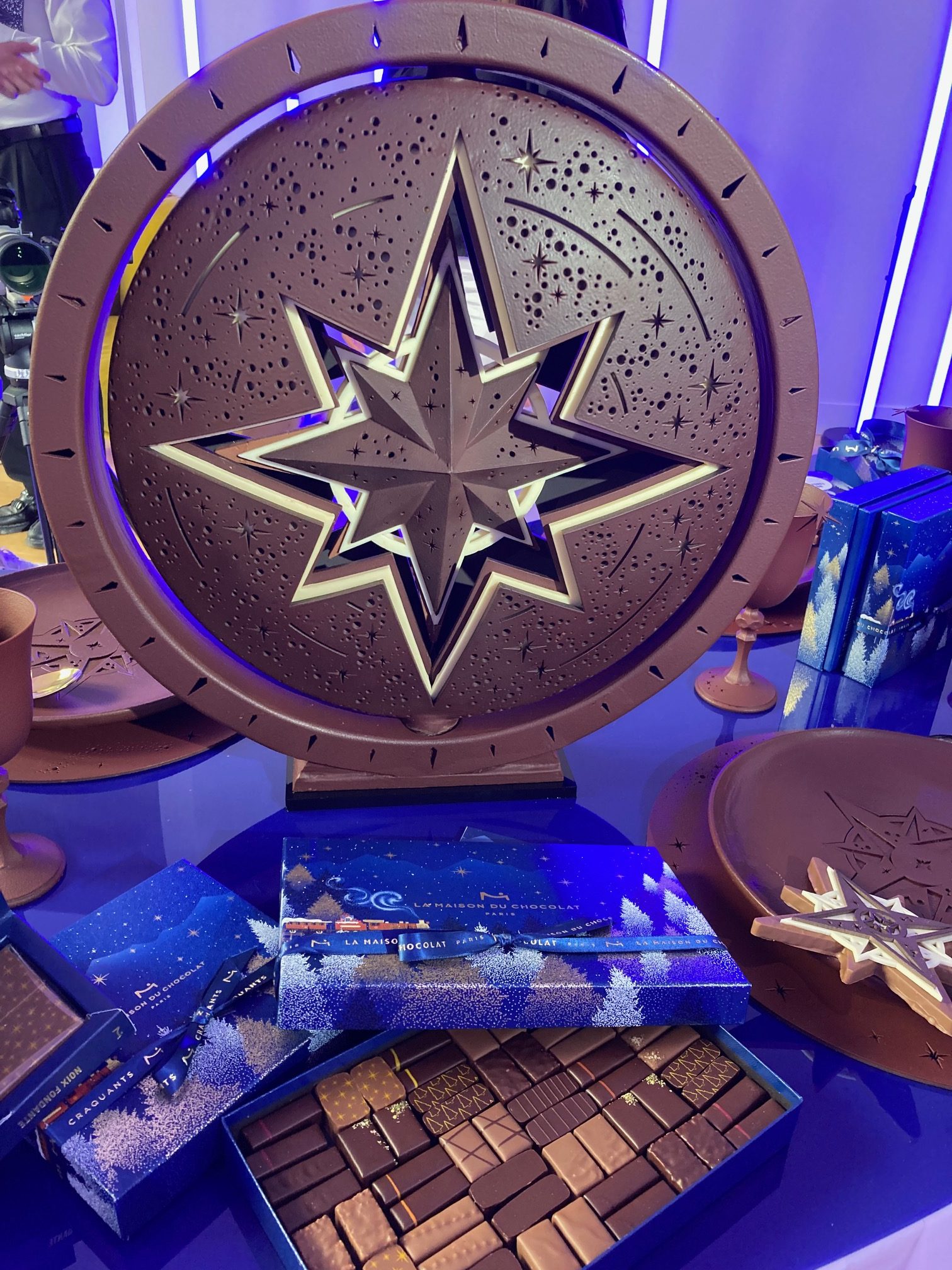 Heureusement, les autres pièces, tout aussi spectaculaires, sont plus accessibles : outre son calendrier de l’avent qui semble comme suspendu dans les airs, la Maison du Chocolat décline sa rose des vents en bouchées aux éclats de noix qui croquent sous la dent avec ses entrelacs en chocolat blanc et noir. Des pièces que l’on peut retrouver dans des ballotins uniques qui ne manqueront pas d’étonner vos invités.