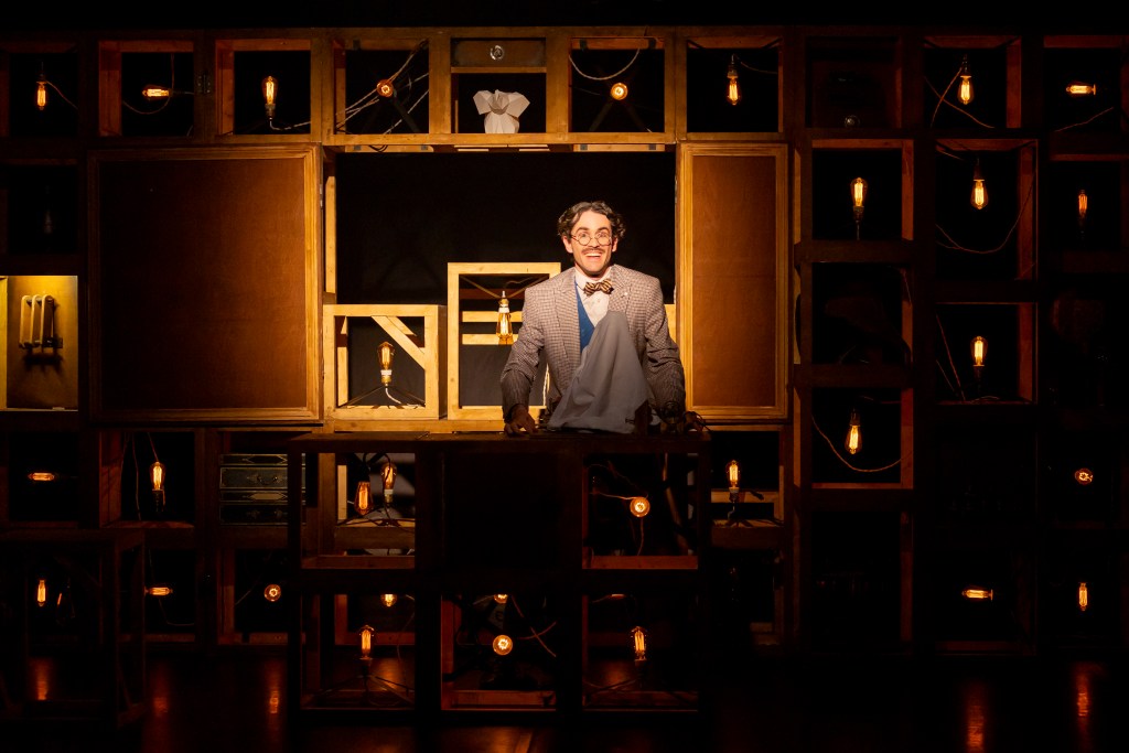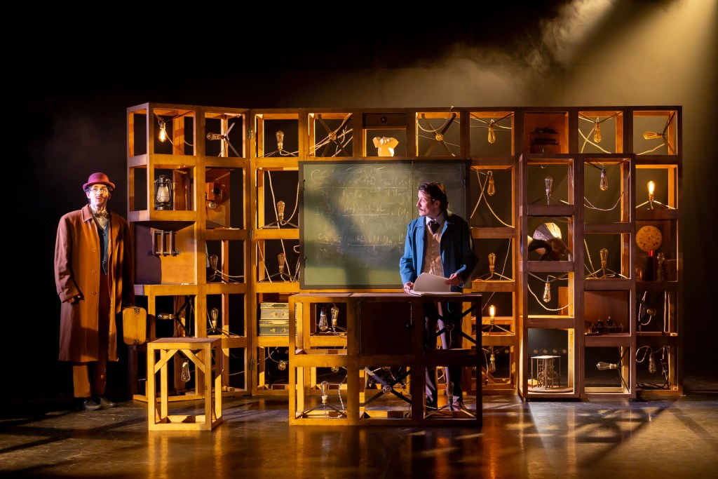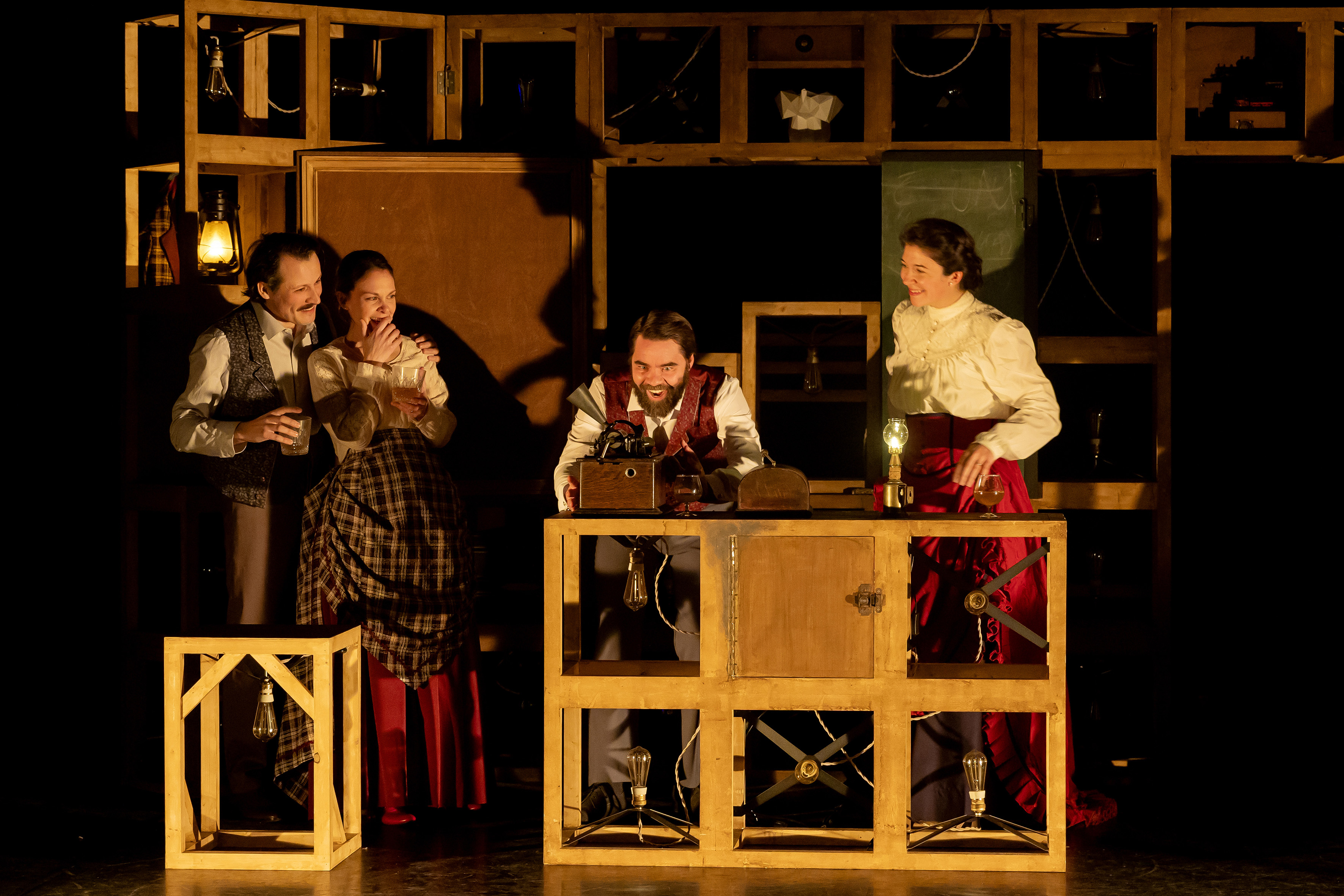 Le Lucernaire, écrin intimiste. Les premiers rangs du Théâtre Rouge du Lucernaire permettent une immersion parfaite dans le spectacle. Le public y est réellement dans l’atelier des inventeurs. Les costumes de Virginie Houdinière évoquent avec harmonie et puissance la mode victorienne. La robe magnifique de Madame Westinghouse en est un exemple de facture remarquable. Les étoffes et les couleurs se répondent et résonnent avec la scénographie intelligente et mobile de Georges Vauraz. Le mur-étagère escamotable est habité d’ampoules et d’éléments-clin d’œil à l’Histoire. Tantôt mur, tantôt cloison. Il permet aussi bien de curieuses allées et venues connues ou secrètes que des ouvertures de portes tonitruantes ou discrètes.