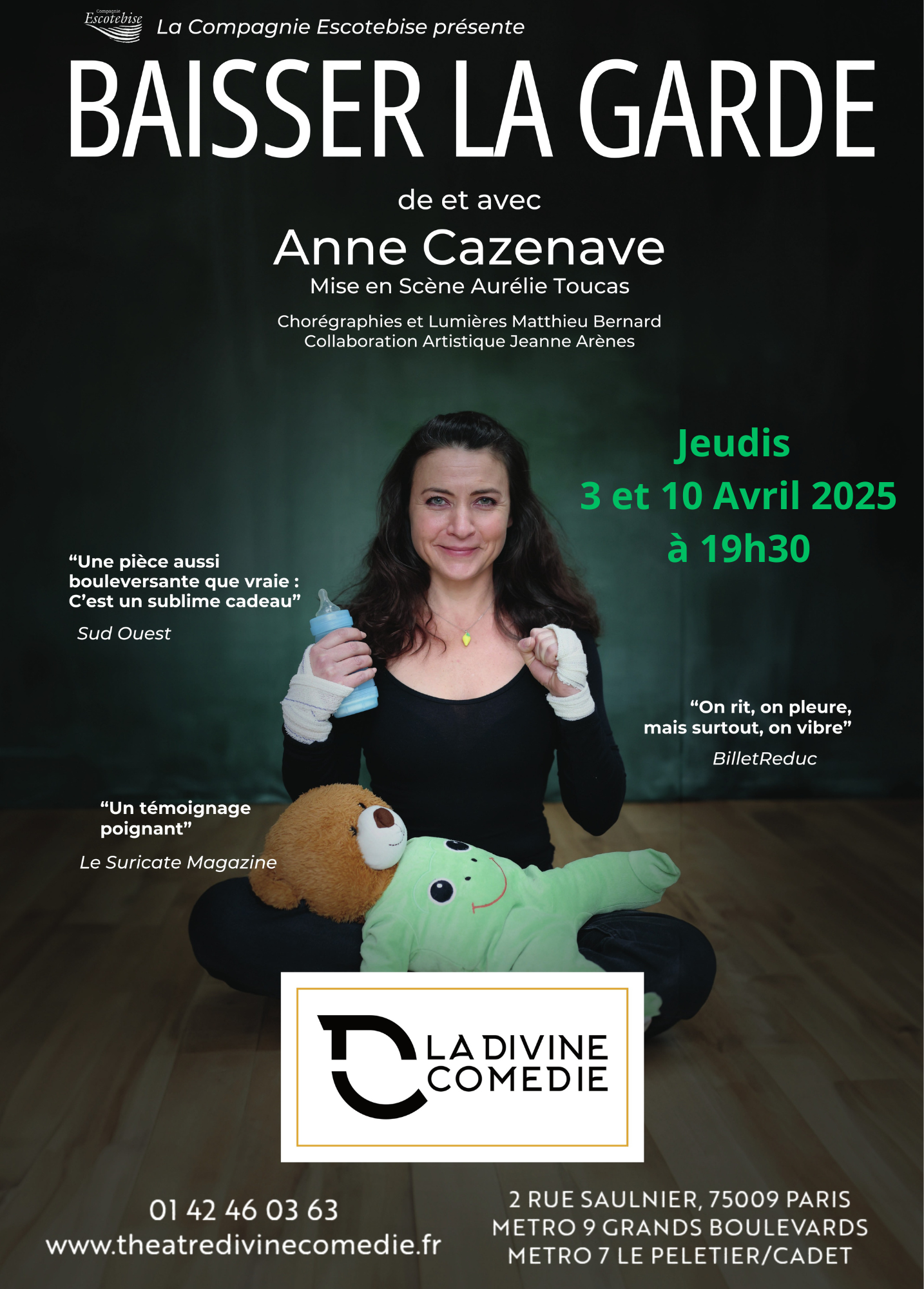 Pour deux dates exceptionnelles, les jeudis 3 et 10 avril 2025, Anne Cazenave est à Paris où vous allez la découvrir, seule en scène, dans Baisser la garde. Elle a écrit et joue ce spectacle vibrant : une maman célibataire se démène pour son fils dans un système inadapté à son enfant et impuissant à l’aider. Elle évoque grâce à son énergie magnifique la puissance de l’amour, interroge avec un humour ravageur la cellule familiale, la charge mentale des femmes, le poids de la culpabilité. Pari réussi de nous faire rire et nous émouvoir aussi par les mots et la danse. Alors pour mieux la connaître, voici ses coups de coeur!
