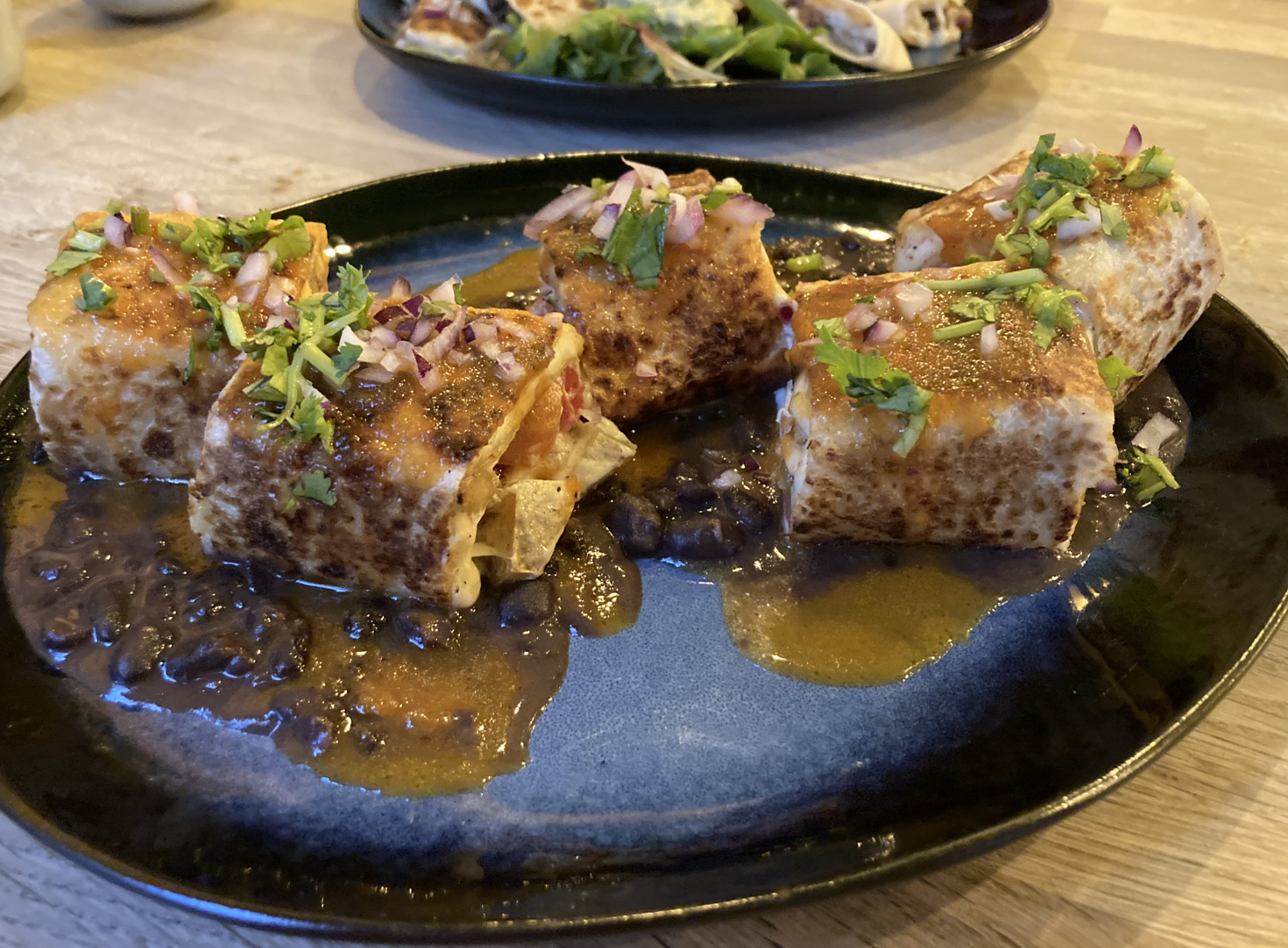 Puis vient le vrai coup de cœur : l’enchilada, végétarienne, farcie de légumes grillés à la plancha, nappée de sauce blanche à l’ail et de fromage fondu. Elle est accompagnée de haricots noirs et de salsa. C’est généreux, réconfortant, bien assaisonné. Une assiette complète et gourmande, qui fait du bien.