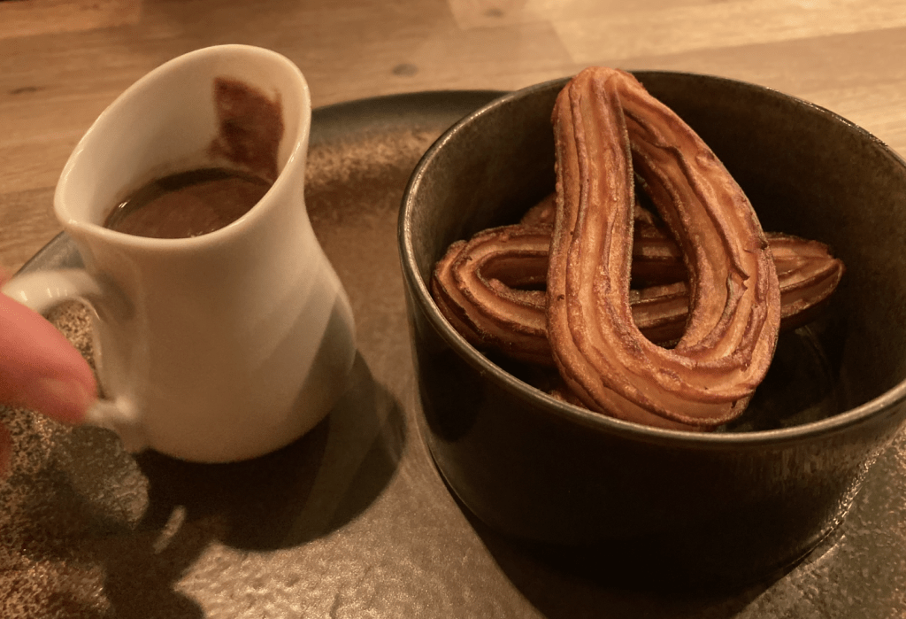 On termine par les churros, servis chauds avec du chocolat. Un basique sans extravagance mais qui permet une note sucrée appréciable pour clore le repas.