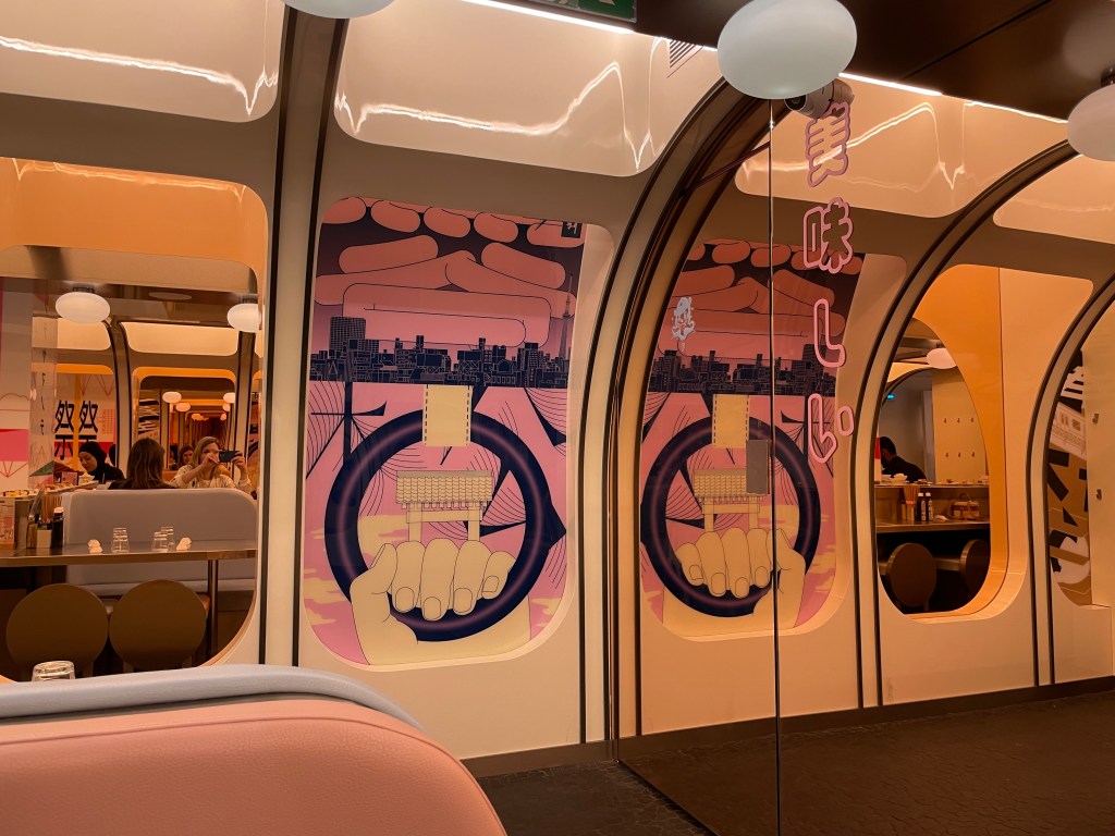 L’autre soir, nous nous sommes retrouvées chez Matsuri, rue du Bac. Je connaissais déjà l’adresse, mais je n’y étais pas retournée depuis la rénovation. Et franchement, la nouvelle déco vaut le détour. C’est ultra contemporain, presque futuriste – des lignes fluides, de l’inox, un côté “wagon de train japonais” qui fonctionne bien sans être froid. On s’installe autour du fameux tapis roulant, et c’est parti !