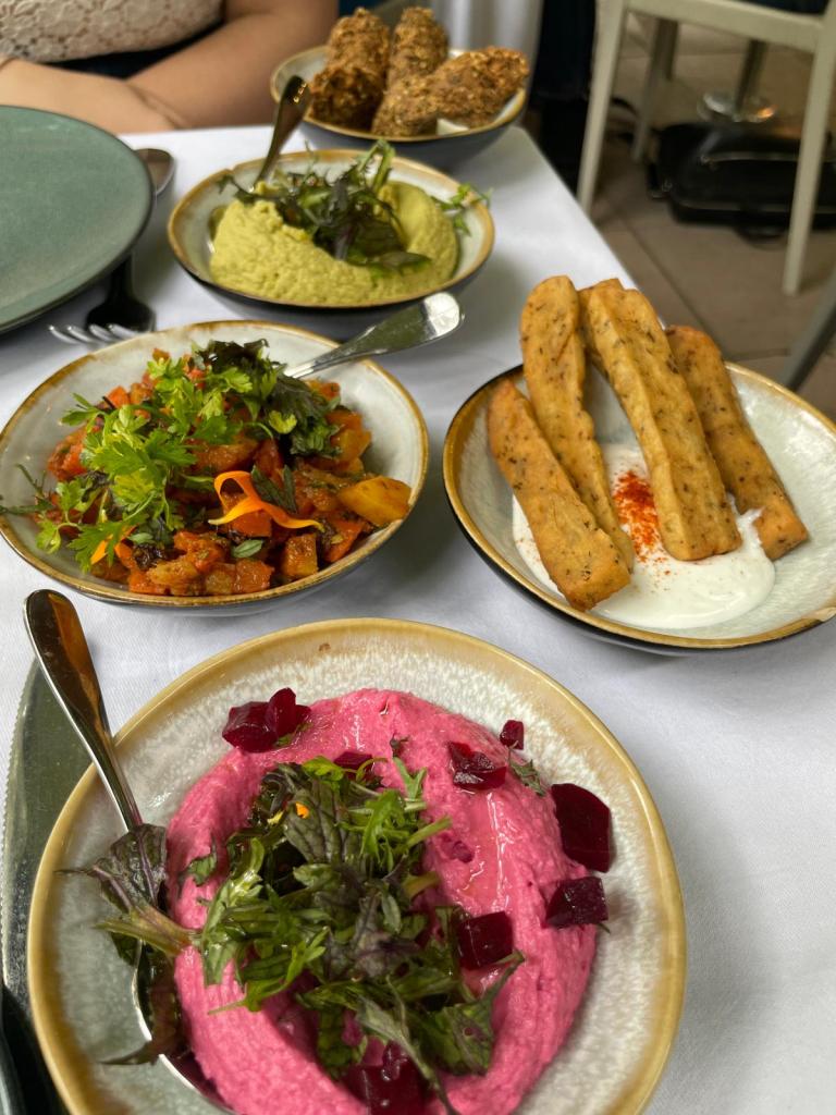 À table, le voyage se poursuit. Nous avons picoré les mezzés maison comme on partagerait des souvenirs d’été : houmous twisté au pesto pistache, houmous betterave velouté, carottes au cumin parfumées, panisses dorées à tremper dans le toum, falafels moelleux escortés de yaourt grec et de tahini.