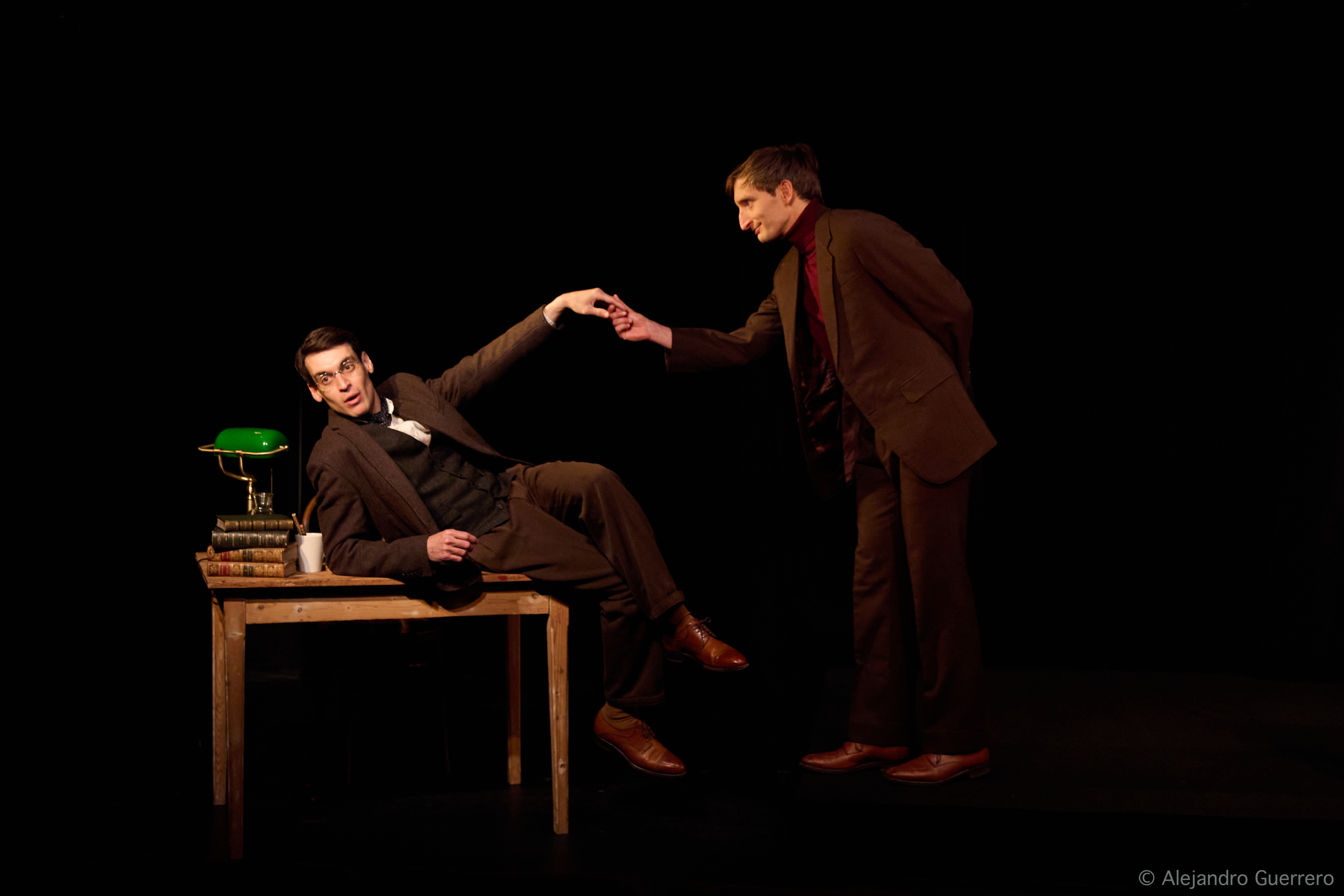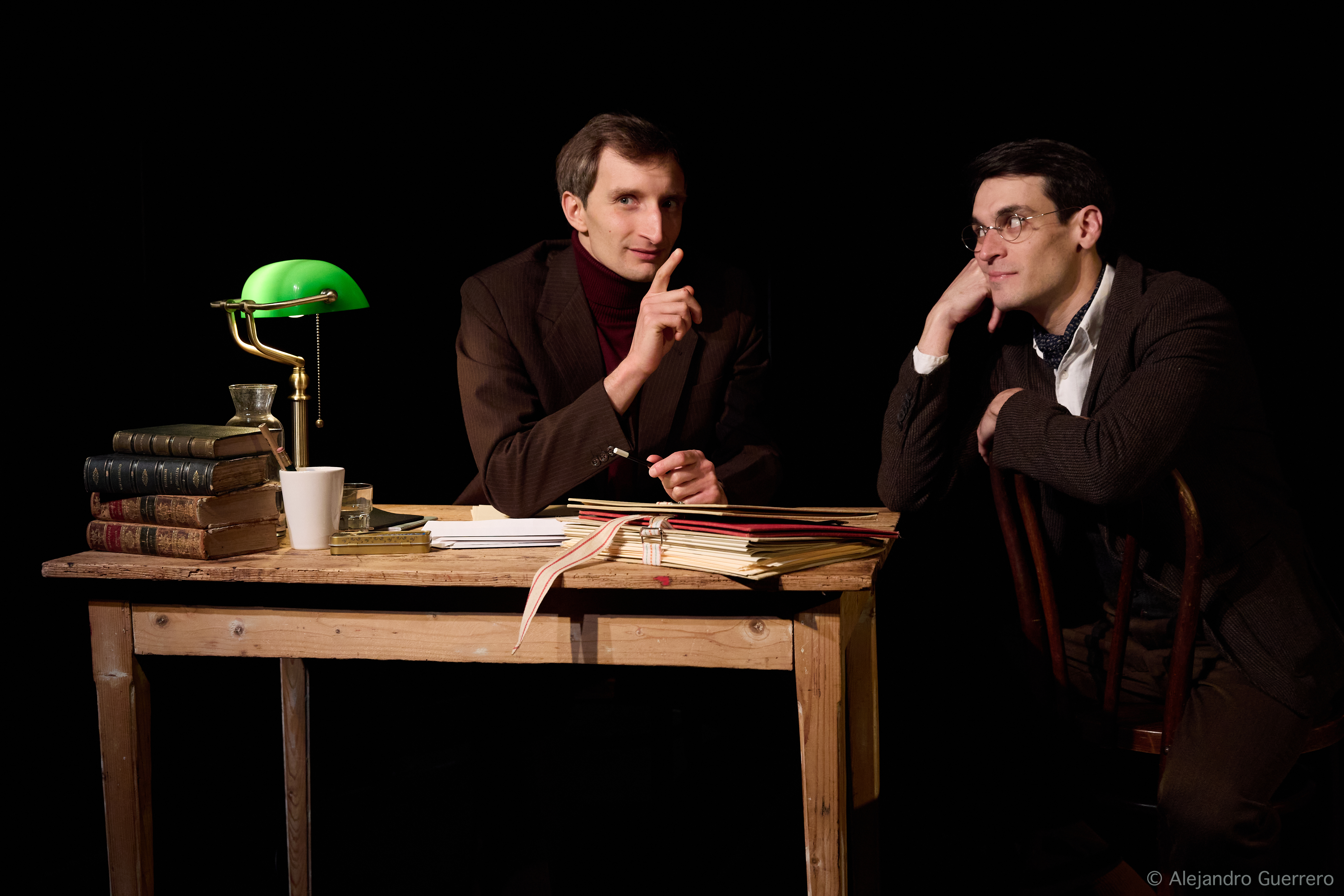 Des auteurs-comédiens polymorphes La pièce se tient dans un décor minimaliste, composé d’une petite scène et d’un bureau. Ceux-ci permettent un jeu constant de dedans-dehors, offrant ainsi un espace vivant et fluide. Emmanuel Gaury, propose une mise en scène intelligente et intense. Les comédiens Gaspard Cuillé et Benjamin Romieux ont également imaginé le spectacle. Ils incarnent tour à tour Jean Anouilh, mais aussi ceux et celles qu’il a côtoyés. Georges Neveux, la princesse Bibesco, mais aussi son camarade de service militaire. Leur jeu est d’une justesse telle qu’ils brisent le quatrième mur, rendant leur présence familière et immédiate.