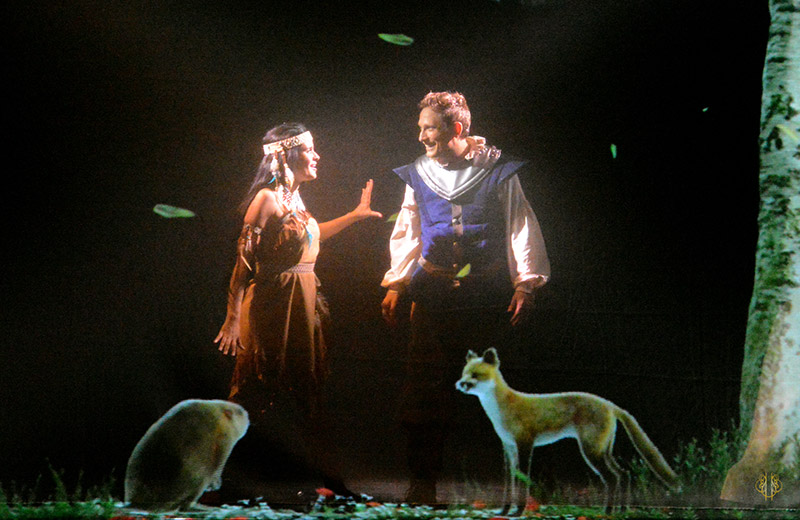 technique importante qui n’évite pas certains couacs, évincés par l’énergie des comédiens-chanteurs dont certains passent sans encombre du rôle d’une grenouille bavarde à celui d’un colon ou d’un Indien en un claquement de doigts ou presque. Le spectacle parle ainsi à tous, aux plus petits (notamment avec une chanson sur l’alphabet permettant changements de costumes et de décor) ainsi qu’aux plus grands (avec de nombreuses références à la culture populaire, des Nuls à Bande organisée). Pocahontas offre ainsi un moment de joie, mais aussi d’émotion au public, ravi de replonger dans une Amérique du XVIIe siècle où tout semblait possible, le meilleur (l’entraide entre les peuples) comme le pire (la cupidité vénale des colons). N’en gardons que le meilleur !
